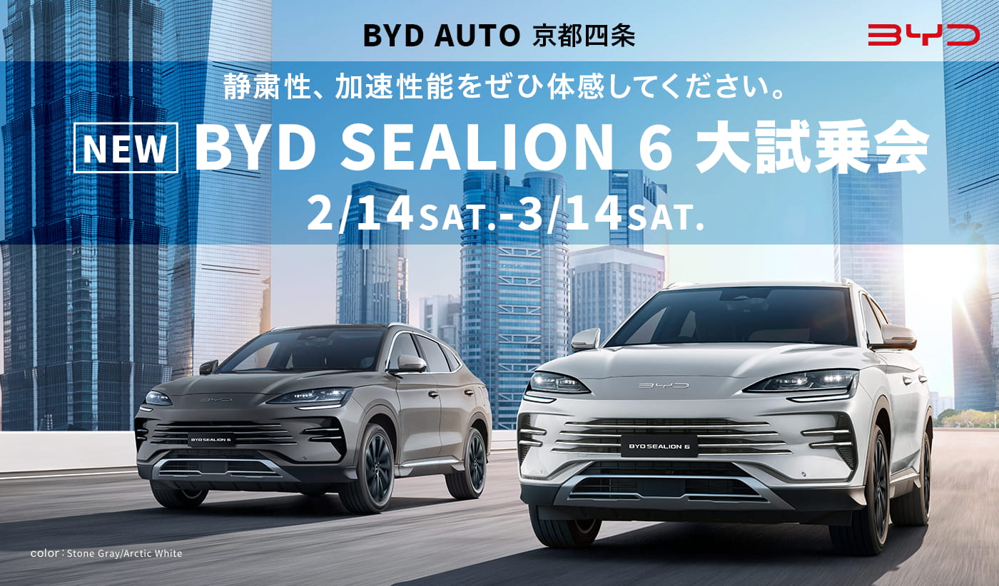 SUPER HYBRID BYD SEALION 6SUPER HYBRID BYD SEALION 6 世界が認めた、ハイブリッドの完成形。世界が認めた、ハイブリッドの完成形。 スーパーハイブリッドがもたらす、4つの革新体験。スーパーハイブリッドがもたらす、4つの革新体験。 圧倒的な燃費・電費コストパフォーマンス圧倒的な燃費・電費コストパフォーマンス 日常のほとんどを電気だけで走り切れること。日常のほとんどを電気だけで走り切れること。 上質な加速走行性能上質な加速走行性能 電気で走ることの価値は、経済性だけではありません。電気で走ることの価値は、経済性だけではありません。 電動のまま、さらに遠くへ行ける安心感電動のまま、さらに遠くへ行ける安心感 「遠出は不安?」その問いに、スーパーハイブリッドは大きな答えを用意しています。「遠出は不安?」その問いに、スーパーハイブリッドは大きな答えを用意しています。 様々なシーンで使える給電機能様々なシーンで使える給電機能 BYD All Lineup こちらの車種もご試乗いただけますBYD All Lineup こちらの車種もご試乗いただけます 店舗情報 Dealer Information店舗情報 Dealer Information